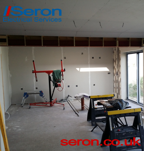 As this was a new extension we provided all new power and lighting circuits together with a new consumer unit. We provided the first fix prior to the walls being dry lined. We used 45 mm deep back boxes so there was plenty of room for cabling. The deeper back boxes allowed for polished chrome screwless 'flush' fitting light switches, sockets and oven switches. We installed new cabling to two new ovens, extra wide electric hob, extractor hood, two integrated fridges and a dishwasher.